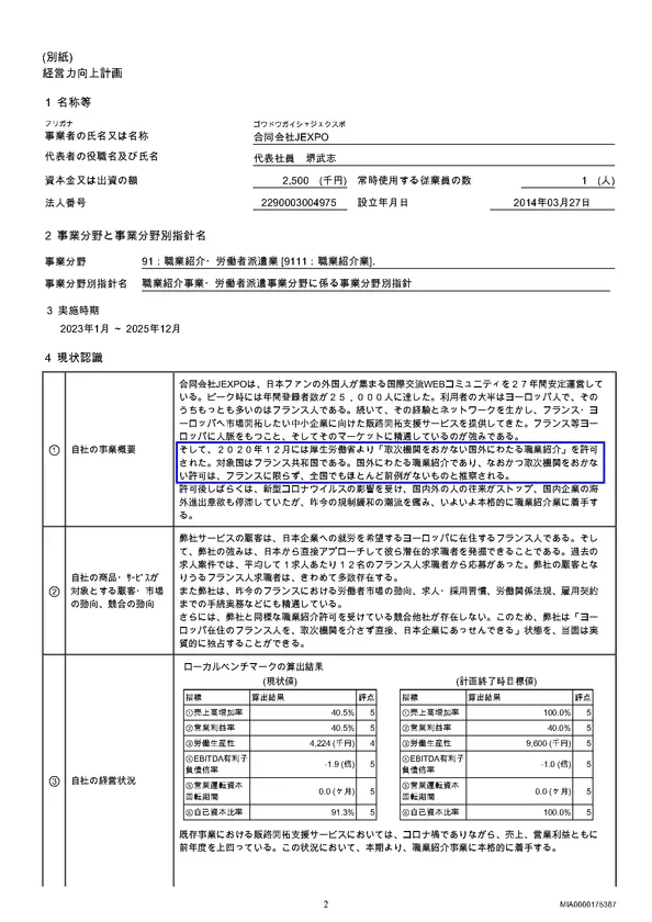 重要なのは、同計画の事業概要の文中「取次機関をおかない国外にわたる職業紹介の許可はフランスに限らず、全国でもほとんど前例がない」という記載に対して、厚生労働大臣の押印とともに厚生労働省本省にご認定いただいた、という点です。