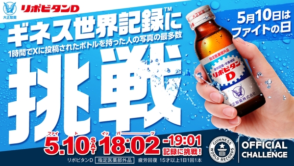 大正製薬株式会社[本社:東京都豊島区 社長:上原 茂](以下、当社)は、来る2025年5月10日(土)の「ファイトの日※」 に、昨年、見事ギネス世界記録™を達成した「1時間でXに投稿されたリポビタンDまたはリポビタンシリーズなどのボトルを持つ人の写真の最多数」の記録更新を目指し、再び皆さまと新たな世界記録へ挑戦いたします。挑戦時間は、同日18時02分からの1時間です。