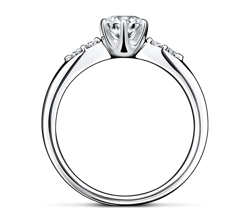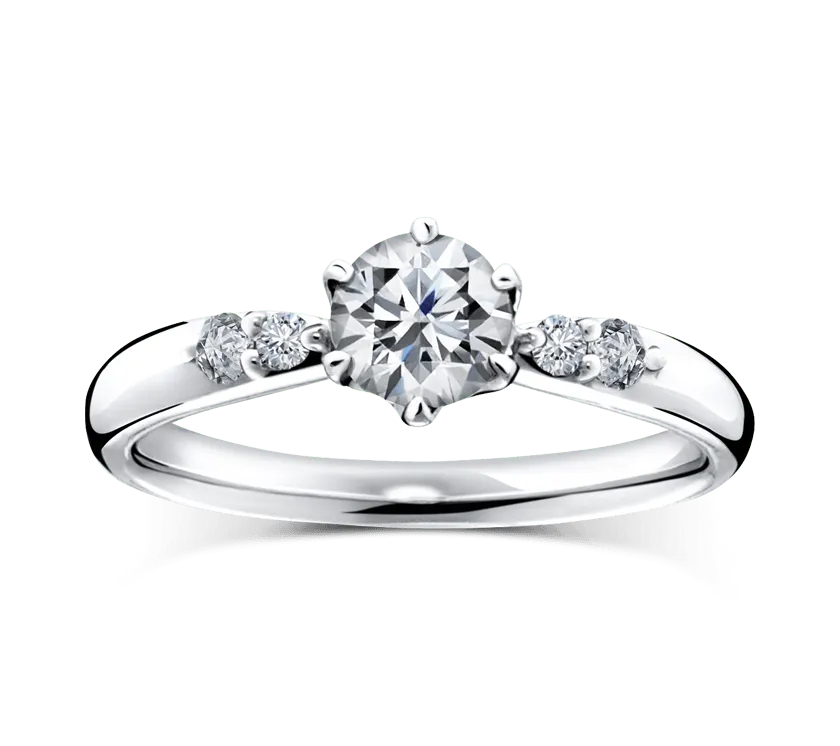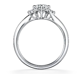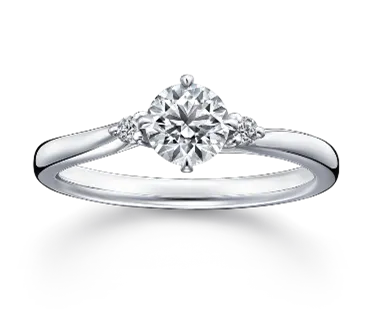 リングのアームに沿って両サイドに配置されたメレダイヤが美しく輝く、シンプルで女性らしいデザインの、オーソドックスなリングです。