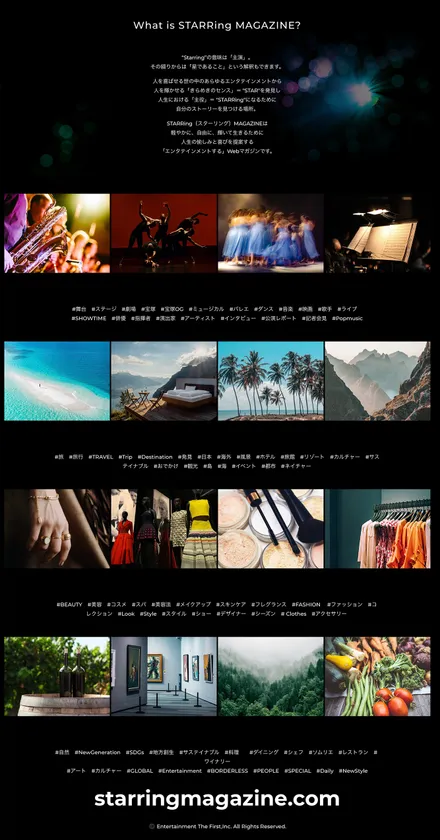 最大の特徴は、ENTERTAINMENT the FIRST, BORDERLESS ENTERTAINMENT(ボーダレス エンタテインメント 人を喜ばせる世の中のエンタテインメント)。コンテンツ軸(=カテゴリ)×キーワード軸(=タグ)で人生における「主役」(“STARRing”)になるために「きらめきのセンス」(“STAR”)を発見する記事メディアです。