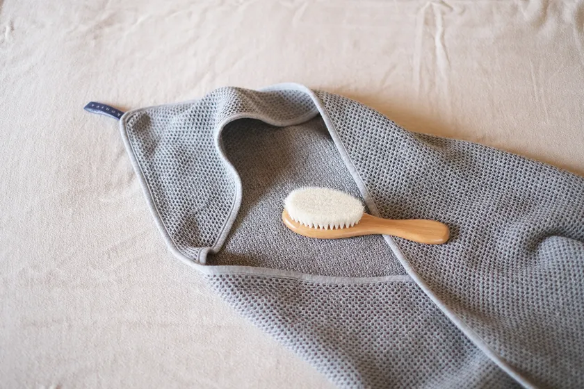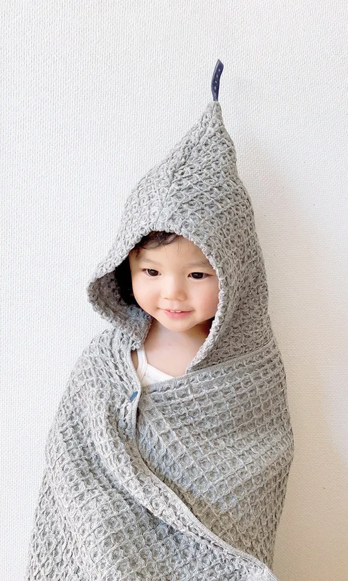 お子さまの頭を包み込むフードが付いたおくるみです。ジェンダーレスなシックなデザインで産院からの退院時にも使え、まだ抱っこに慣れていない方のサポートをしてくれるアイテムです。生地はリネン混紡糸を使用したボリューム感のあるワッフル織で、肌に接する表面積が少なくサラッとした肌ざわりが特徴です。通常のパイルタオルより乾きが速く、部屋干しが増える梅雨の時期や、気温の低い冬場のご使用にもおすすめです。
