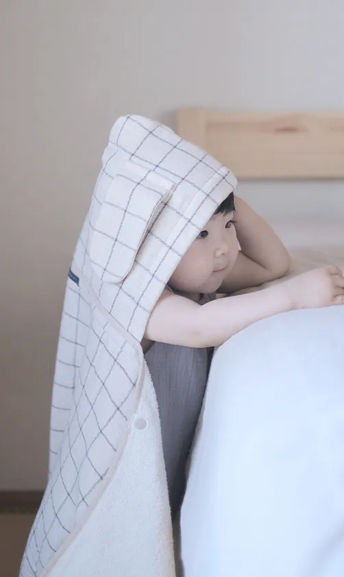 フード付バスタオルとはその名の通り、子どもの頭を包み込むフードが付いたバスタオルのことです。お風呂上りの湯冷め防止はもちろん、水遊び後の日焼け対策としても活躍。どのタイプの生地も綿本来の自然な柔らかさを実感できるように、素材・製織・後加工までこだわり、吸水性・速乾性に優れたタオルを使用しています。フードにはそれぞれ特徴があり、とんがり帽子のようになるものやドロップイヤーがついたものなど、過度な装飾を抑えたジェンダーレスなデザインとなっています。