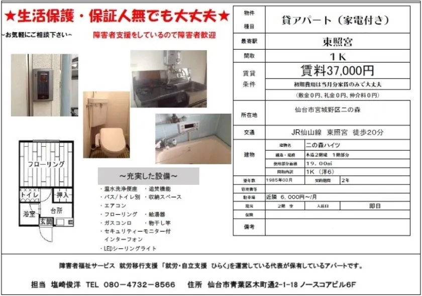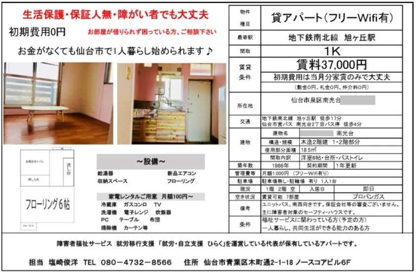 宮城・仙台の保証人不要アパートで精神障害者の自立を応援! 一人暮らし&就労移行支援で障害者雇用の就活サポート 2023年1~3月末日まで入居者募集