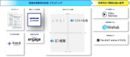 プレスリリースや特設ページ、採用HPの作成、Web広告での告知に加え、各求人サイトでの集客支援を行ないました。『エン転職』『AMBI』『ミドルの転職』とターゲットの異なる3つの求人サイトを活用することで、ターゲットへ網羅的に求人をお届け。また、ビデオ面接ツール『VideoInterview』、採用管理システム『Hirehub』、適性診断テスト『Talent Analytics』も提供し、選考フローを支援。求職者と同社の適切なマッチングを実施しました。