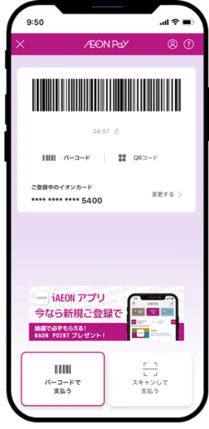 イオンのグループ店舗をはじめとした全国のAEON Pay加盟店のレジにて、スマートフォンに表示されたコードを提示することで、簡単に決済することができます。