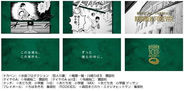 「ここに来れたのは仲間がいたから。」のフレーズで始まる本動画では、それぞれの作品で甲子園出場を目指して切磋琢磨するチームメイトやライバル達の「友情」を描き、登場人物達の熱い思い、仲間との絆などを想起させる内容となっています。最後は「この友情、この場所も、ずっと僕らの中に」と結ばれ、いつの時代も聖地として目標とされてきた甲子園の存在を思い起こさせてくれます。