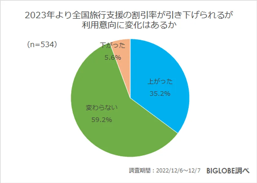 また、「2023年より全国旅行支援の割引率が引き下げられるが、利用意向に変化はあるか」を質問すると「変わらない」(59.2%)が6割と最も多かった。