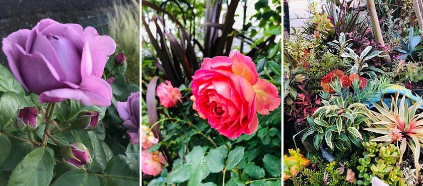 賢幸さんが当初楽しんでいたバラ(左、中)や、現在のお気に入りの植物が並んだお庭(右)