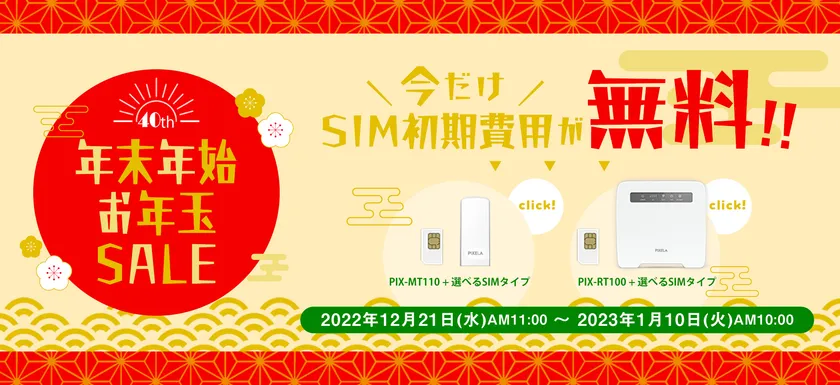デジタル機器を通じて新しい生活を提案していく株式会社ピクセラ(本社:大阪府大阪市、代表取締役社長:藤岡 浩)は、2022年6月21日(火)に創業40周年を迎えました。創業40周年を記念し「ピクセラモバイル公式ショップ next mall」では、設置工事の必要がなく申し込んでからすぐに使える、コンセントにさすだけでWi-Fi環境を実現する『“SIM設定済”ホームルーター(PIX-RT100)+選べるSIMタイプ』および『“SIM設定済”LTE対応USBドングル [PIX-MT110]+選べるSIMタイプ』のSIM初期費用が“0円”になる年末年始お年玉セールを2022年12月21日(水) 11:00~2023年1月10日(火) 10:00まで開催いたします。