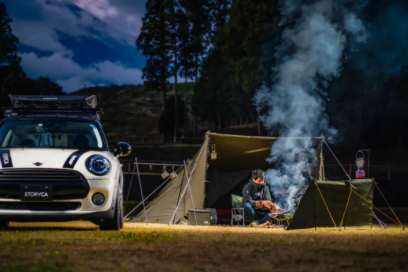 走りも楽しめるMINI 3 DOOR.にルーフラックやホイールなども装着し、STORYCA仕様にコーディネート。ソロキャンプデビューにふさわしいこだわりのギアを選定し、あらかじめリアラゲッジに収納しています。