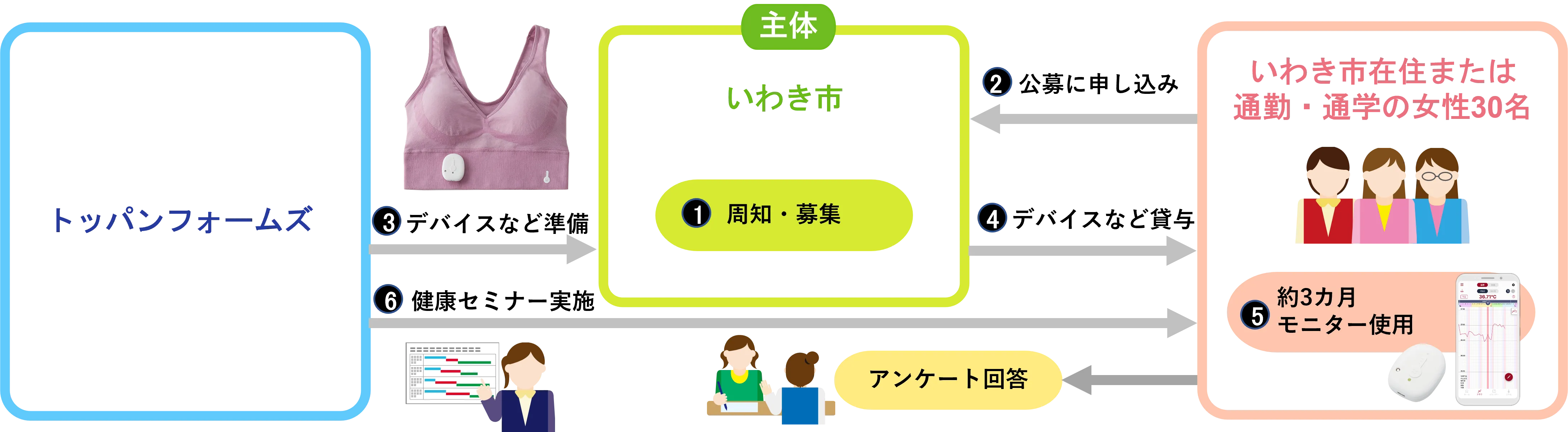 福島県いわき市(市長:内田広之、以下いわき市)は、いわき市内在住または通勤・通学をしている18歳以上の女性を対象に「ウェアラブルデバイスによる体調管理サポート事業」の募集を本日から開始し、本事業における健康管理のサポートツールとしてトッパン・フォームズ株式会社(本社:東京都港区、代表取締役社長:添田 秀樹)が開発したヘルスケア IoT サービス「わたしの温度」を採用することを発表します。いわき市は「わたしの温度」を参加者に貸与し、約3カ月間使用していただくことで女性特有の温度リズムを把握して自身の健康管理に役立てていただきます。