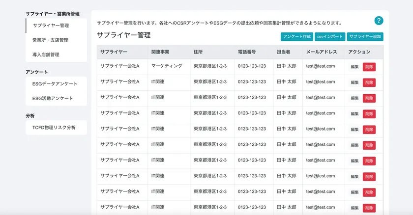 このたび、ESGの開示業務の中でも負荷の大きいサプライヤー管理を効率に行える機能を新たに追加し、リリースしました。サプライヤーや営業所・支店、導入店舗を簡単に行えます。さらに、物理リスク分析やアンケート機能を新たに追加しました。