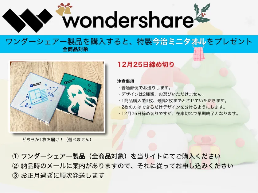 すべてのWondershare製品が対象です。ご購入後、商品をお届けするメールの中に、申し込み方法が案内されています。こちらを確認の上、お申し込みいただくだけで今治ミニタオルとSnipaste 2 Proが手に入ります。今治ミニタオルは在庫がなくなり次第終了となりますので、気になる方はお急ぎください。また期間中、Wondershare製品は全品1,000円引きで販売されます。