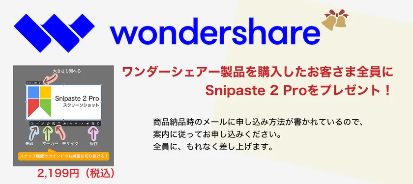 ダウンロードGoGo!でも人気のスクリーンキャプチャソフト、Snipaste 2 Pro(販売価格2,199円)を、Wondershare製品ご購入のお客さまに1つ無料でプレゼントいたします。