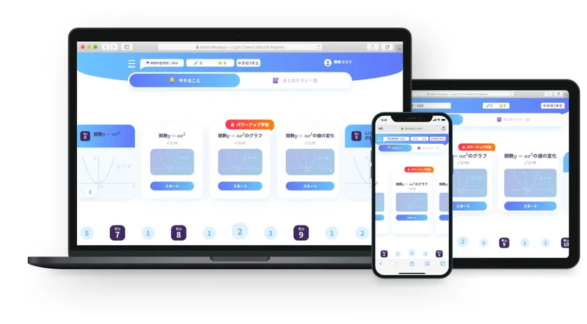 学習内容が定着しているかを単元ごとの「まとめテスト」で確認することができます。何度でもチャレンジでき、しっかりと復習を重ねることで学力の向上を促します。