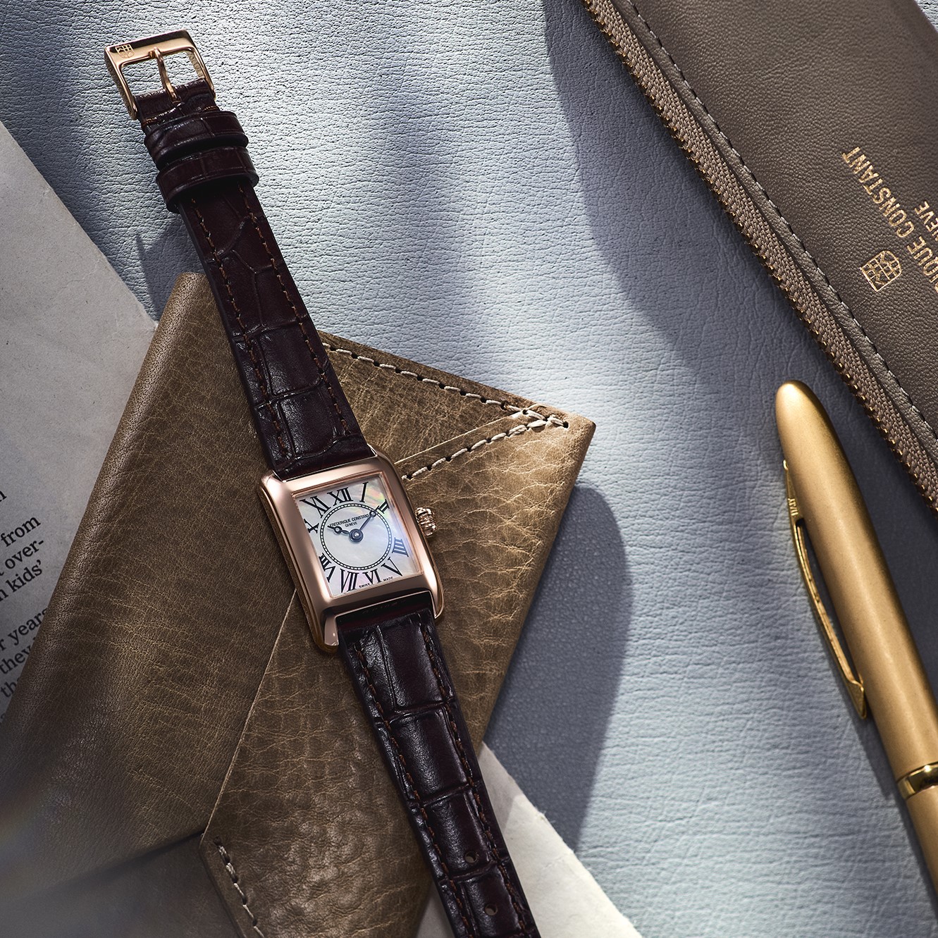 フランス語で「スクエア」を意味する「カレ(Carree)」。1920年代後半に時代を博したエレガントでファッショナブルな女性からインスピレーションを受けたデザインに、ローマ数字インデックス、艶やかなマザーオブパール文字盤、ブレゲ調針を採用した日本限定モデル。クラシカルエレガントな表情で手元を美しく飾ります。