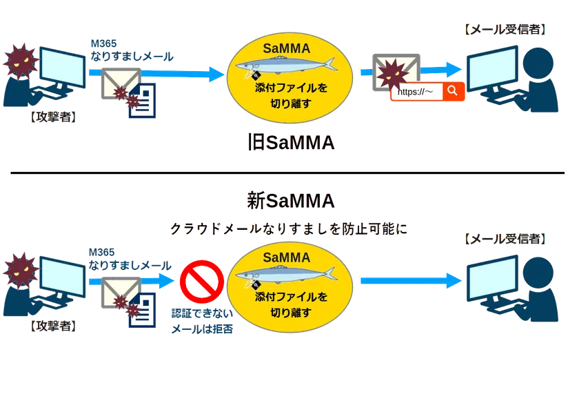 今までのSaMMAでは、Microsoft 365のメール機能『Exchange Online』のような、クラウドサービスのメール機能を利用している場合、送信元認証ができずクラウドサービスになりすましたメールか否かの判別ができませんでした。そこで、クラウドサービスのメール機能でも送信元認証ができるようにするため、『クラウドサービス連携機能』を開発しました。これにより、SaMMAとメール機能を安全に連携することができるようになります。