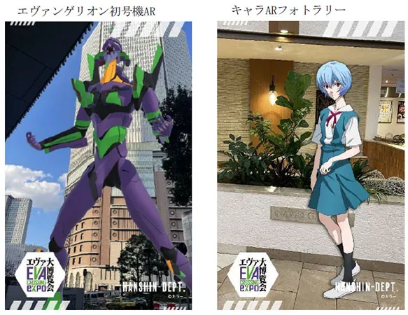 具体的なコンテンツとしては、世界的に大人気のアニメ作品『エヴァンゲリオン』の主人公碇シンジが搭乗する汎用人型決戦兵器エヴァンゲリオン初号機が、大阪梅田の街中に実物大で出現した姿を楽しめる「エヴァンゲリオン初号機AR」、「エヴァンゲリオン大博覧会」の関連ワードをあしらったテキストアートが梅田の空に浮かぶ「EVAEXPOフォントウォールAR」、エヴァンゲリオンのパイロット「碇シンジ」「綾波レイ」「式波・アスカ・ラングレー」「真希波・マリ・イラストリアス」「渚カヲル」とAR写真撮影を楽しみながら大阪梅田エリアの体験スポットを巡る「キャラARフォトラリー」がございます。