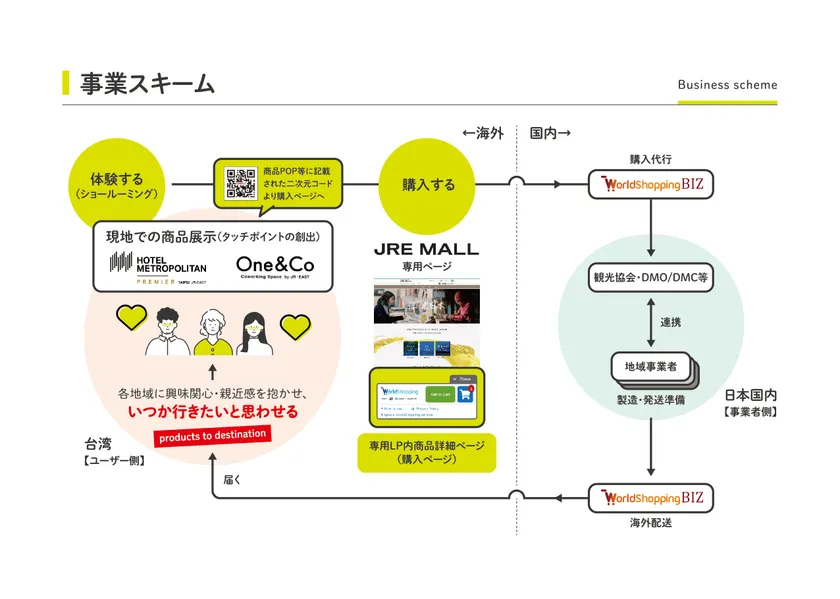 各海外拠点で地産品を体験していただき、欲しいと思った時に、スマートフォンからQRコードを読み込み、その場でオンライン購入できる仕組みをつくります。今回は、台湾のJR東日本グループが運営するホテルやオフィスで実施し、ご利用いただいているお客さまに商品の魅力を感じてもらうことで、新しい旅マエの体験を創出します。