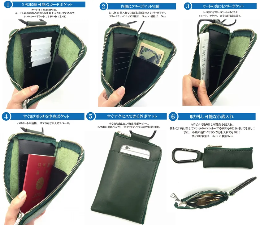スリムなアウトドアショルダーにこだわった逸品。マチはできるだけスリムに、でも容量はちゃんと入るよう設計。カードは5枚収納可能。中にはフリーポケットが2つ。ご自身の用途に合わせて、お札やチケットはサイドのフリーポケットへ。中央のスペースにはスマホを。スマホをすぐに取り出したい方は外側のポケットに。そして、こだわりポイントの使い易さを重視した縦型L字ファスナー。開口部が広いので、中身の見やすさ、取り出しやすさも抜群。そして取り外し可能な小銭入れも完備。アウトドアショルダーと一緒に持ち歩いても良し、単品で持ち歩いても良し!