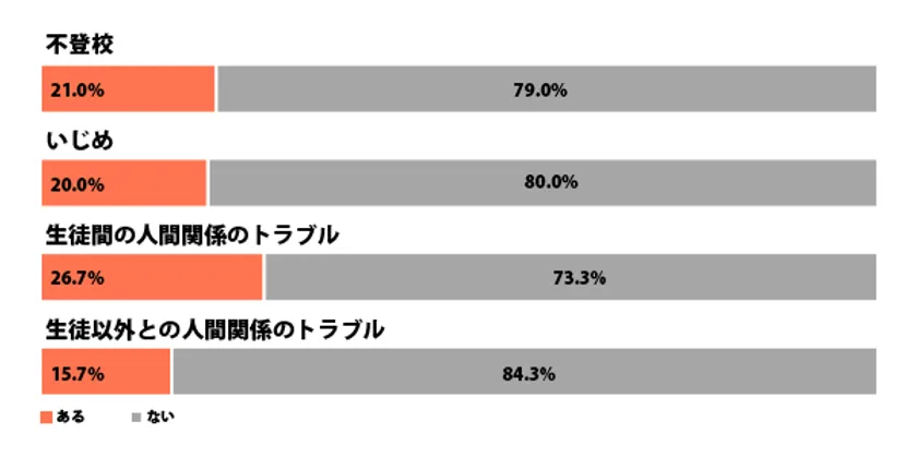 一方、不登校やいじめの経験、人間関係のトラブルにあった経験が「ある」という方も少なからずいるようです。いじめや不登校の原因となる可能性がある「生徒間の人間関係のトラブル」は28.0%の方に経験があることがわかりました。また、身近な方の経験では5人に1人に不登校やいじめの経験があるようです。いじめや不登校は遠い世界のものではなく、身近な問題であると言えそうです。