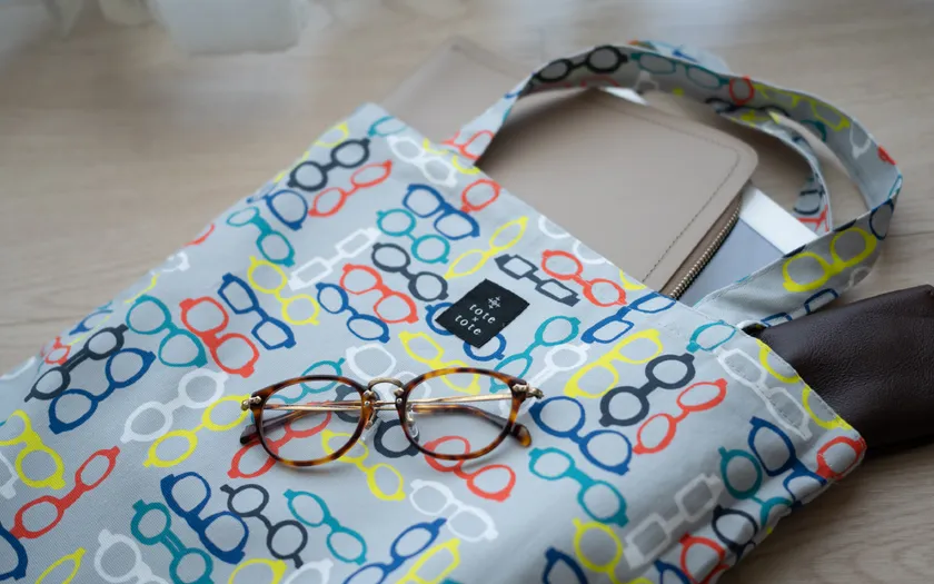 いろいろなメガネをちりばめたデザインのトートバッグ、めがね好きなあの人にプレゼントしてみては?