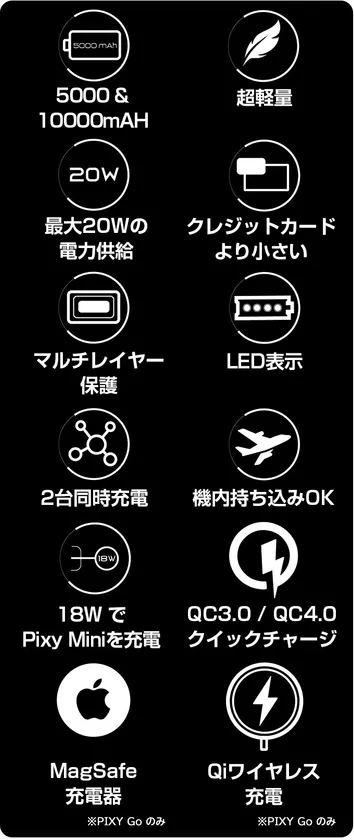 超軽量98gのPIXY MINI、ワイヤレス充電できるPIXY GO ライフスタイルに合わせて選べる2つのモバイルバッテリー