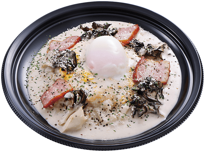 白米の上にとろッとしたスクランブルエッグ・風味と食感が特徴的な黒舞茸・ジューシーなベーコンを乗せ、香り豊かで濃厚なポルチーニソースをかけ、さらに温泉玉子をトッピングした洋風ライスプレート。