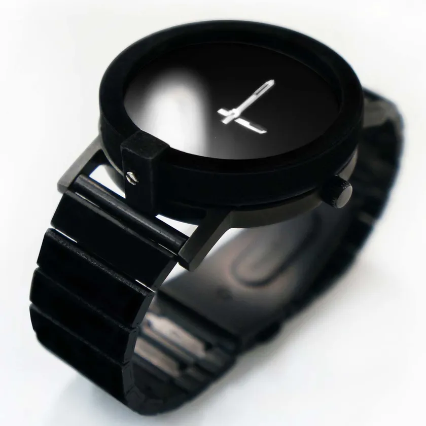 光の反射がほとんどないために文字盤は凹凸が判別できないばかりか、反射がほとんどないため、3Dではなく2Dに見えるデザイン。まさに世界一表情のない腕時計です。腕に装着すると、そこだけ漆黒の異物にまとわりつかれた、まるでブラックホールに覆われ腕が途切れているように見えます。これはある意味デザインを吸収してしまう究極のデザインです。