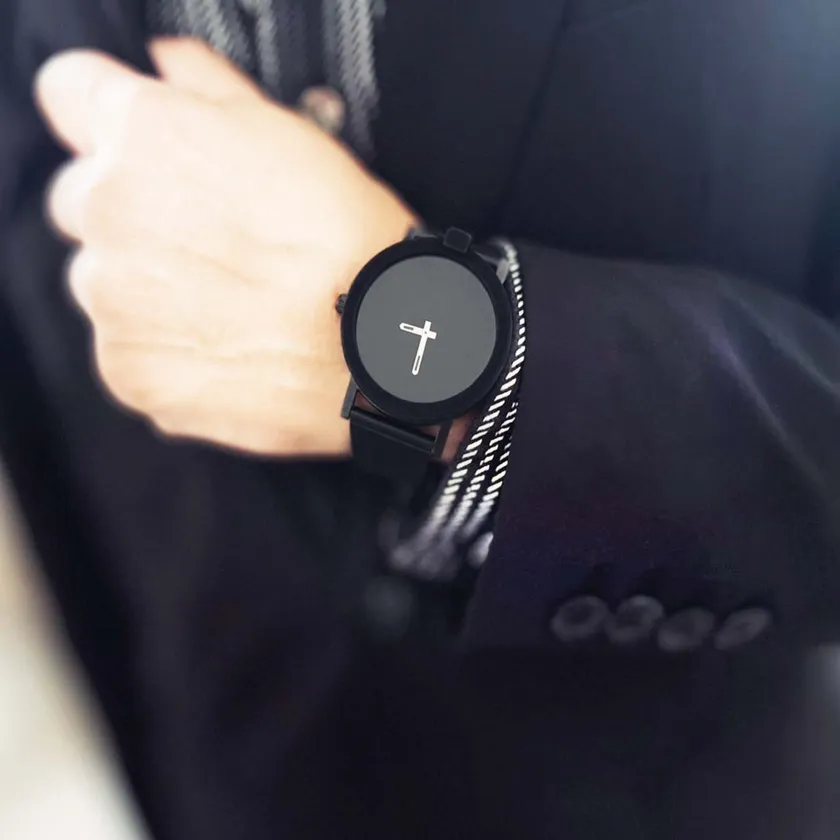 フォーマルにもカジュアルにも合う、服装を選ばない漆黒の時計。