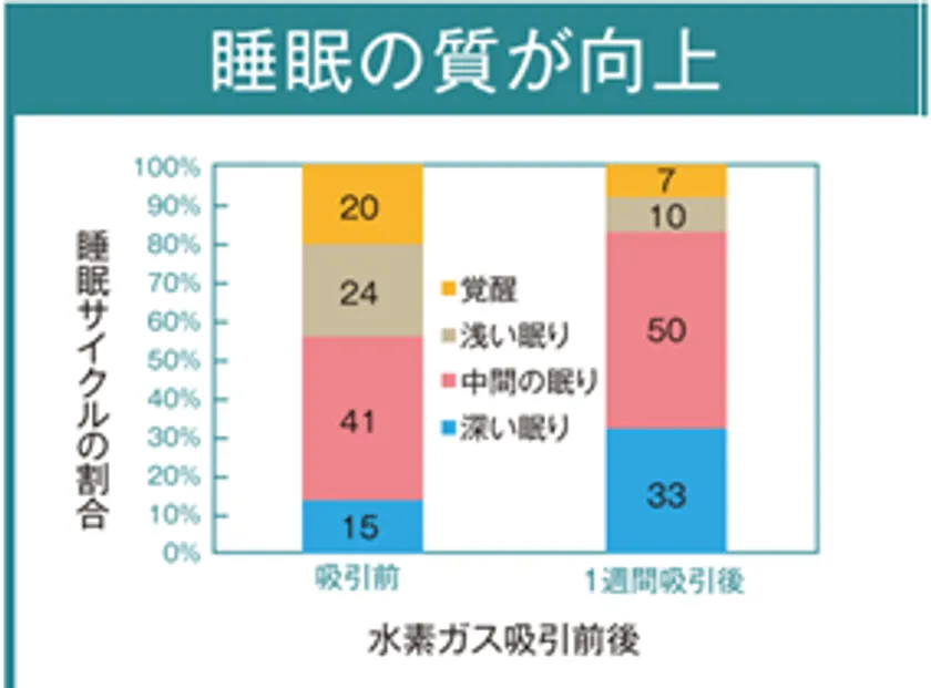 水素ガスを1週間毎日朝晩の2回吸引した結果、吸引前と比べて、ノンレム睡眠(深い眠り+中間の眠り)は約48%向上しました。