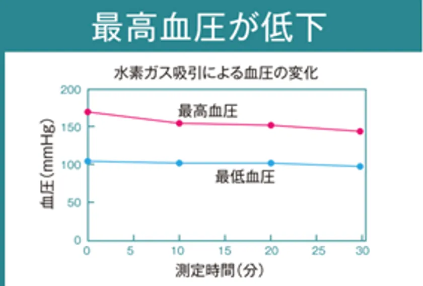 30分間水素ガスを吸引後、10分間隔で30分間血圧を想定した結果、最低血圧はほとんど変化が見られませんでしたが、最高血圧は低下する傾向が見られました。水素ガス吸引前の血圧は最高169/最低104でしたが、水素ガス吸引後には、正常値に近い最高143/最低97まで低下しました。