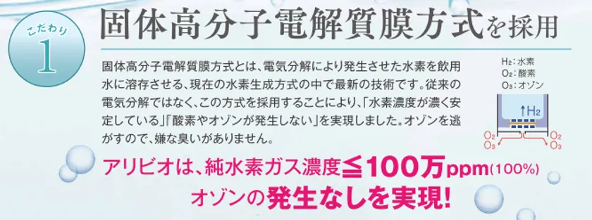 固体高分子電解質膜方式とは、電気分解により発生させた水素を飲用水に溶存させる、現在の水素生成方式の中で最新の技術です。この方式を採用することにより、「水素濃度が濃く、安定している」「酸素やオゾンが発生しない」を実現しました。またオゾンを逃がすので、嫌な臭いがありません。