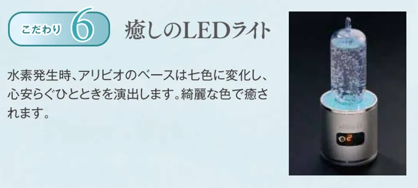 水素発生時、アリビオのベースは七色に変化し、心安らぐひとときを演出します。綺麗な色で癒されます。