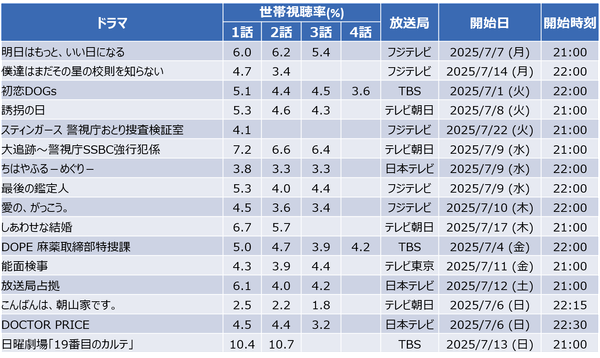 まずは、2025年夏ドラマの初回から第4話までの世帯視聴率の推移を見ていきましょう。以下の表は、主要16作品の各話視聴率をまとめたものです。