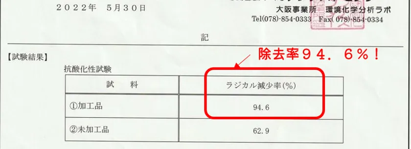 当社は、直接肌に触れることで活性酸素を除去する素材を開発し、専門機関の試験において、約95%の活性酸素を除去ことが証明されました。