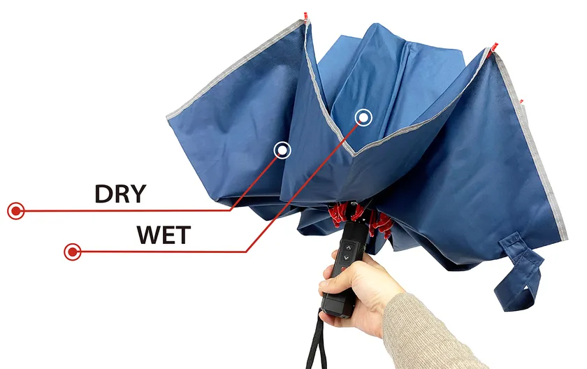 傘を閉じるとき、「雨で濡れている面が裏側に隠れ、濡れていない面が表側に出てくる」逆開閉式を親骨に採用することにより、傘を畳むときに手が濡れにくい。さらに、構造上傘が自立するので、さっと地面に立てて置いておくことも可能です。