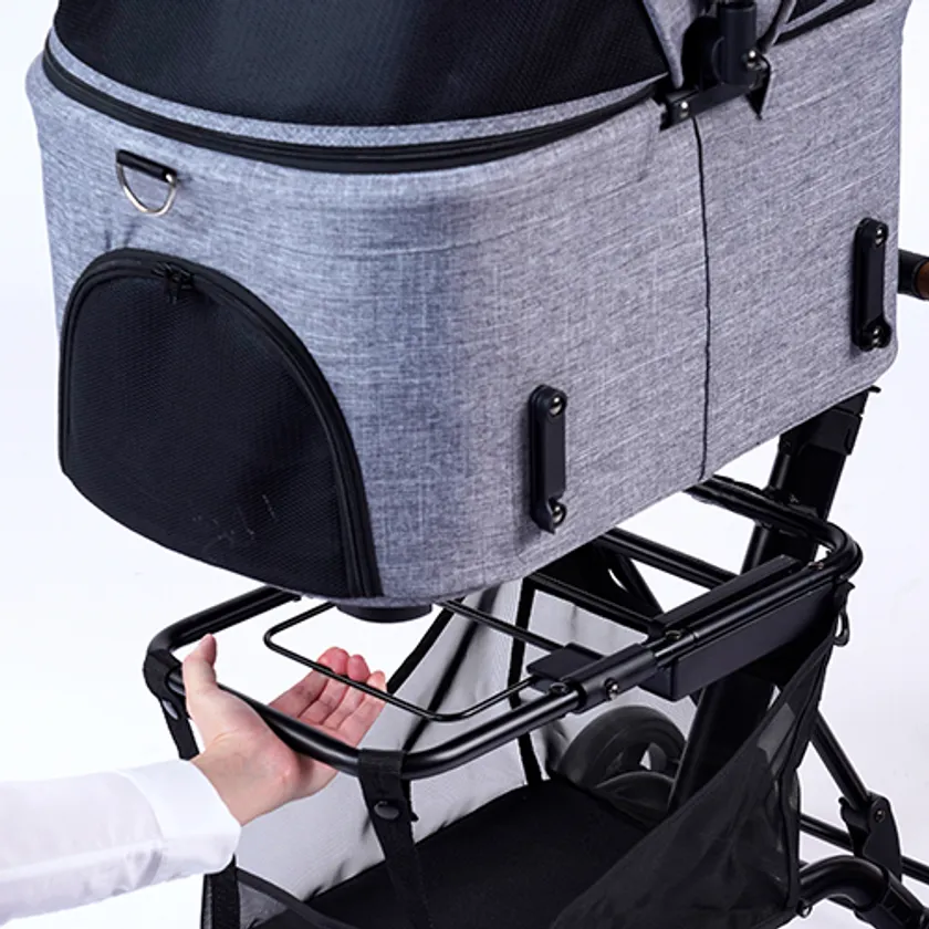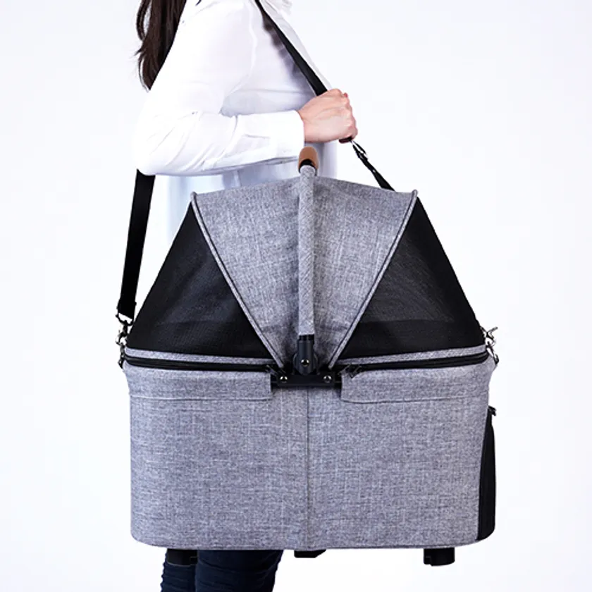 空港内での移動に便利な「WIZ(ウィズ)」は、スムーズな取り回しとコンパクトさが魅力のペットカートです。フレームとケージがワンタッチで分離し、フレームを小さく折りたたむことができるので、移動時はカートとして、機内ではケージを取り外して安心できる居住スペースとして、ペットを乗せたままストレスなく移動が可能です。座席のシートベルトにしっかりと固定でき機内でも安心して過ごせます。