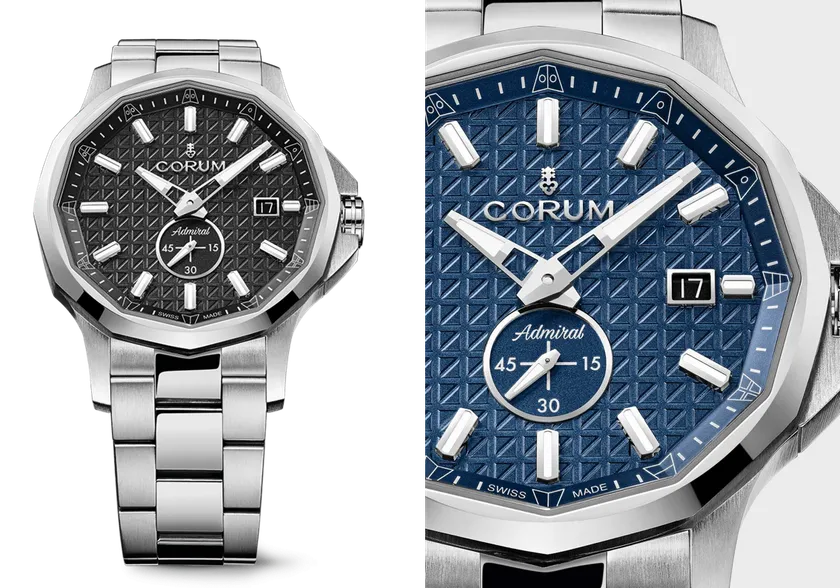 この度、42mmケース・ステンレススティール製ブレスレットの『アドミラル』がついに国内初入荷し、販売を開始します。ダイアルに施されたコルム独自のエンボス加工が存在感を放つ、洗練されたラグジュアリースポーツウォッチです。ラインナップには、ブルーダイアル・ブラックダイアルの2色を展開します。
