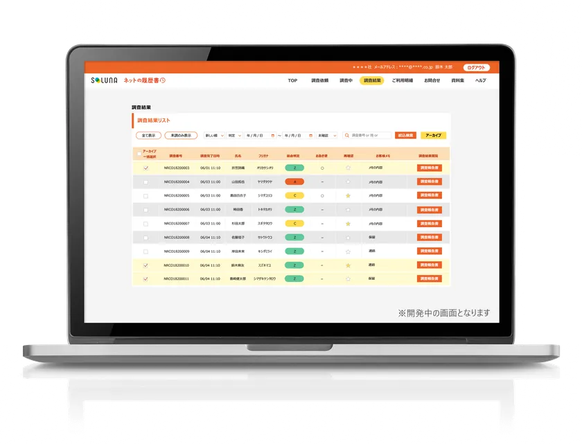 ソルナ株式会社(本社:東京都中央区、代表取締役:三澤 和則)は、展開するSNS時代の人物健全度調査サービス『ネットの履歴書』において、調査報告書に「メモ」「再確認フラグ」「アーカイブ」機能を新たに追加、調査結果の総合判定表示をはじめシステム画面デザインを2023年1月10日(火)よりリニューアルいたします。