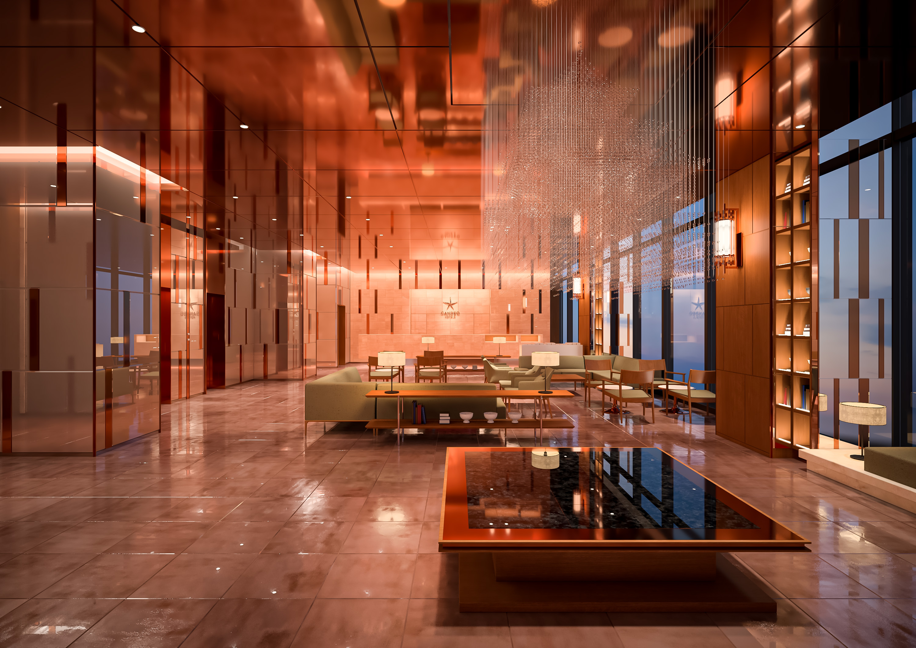 ■ホテルの内装デザインは、ブロンズ、トラバーチン、ウォールナットで構成して