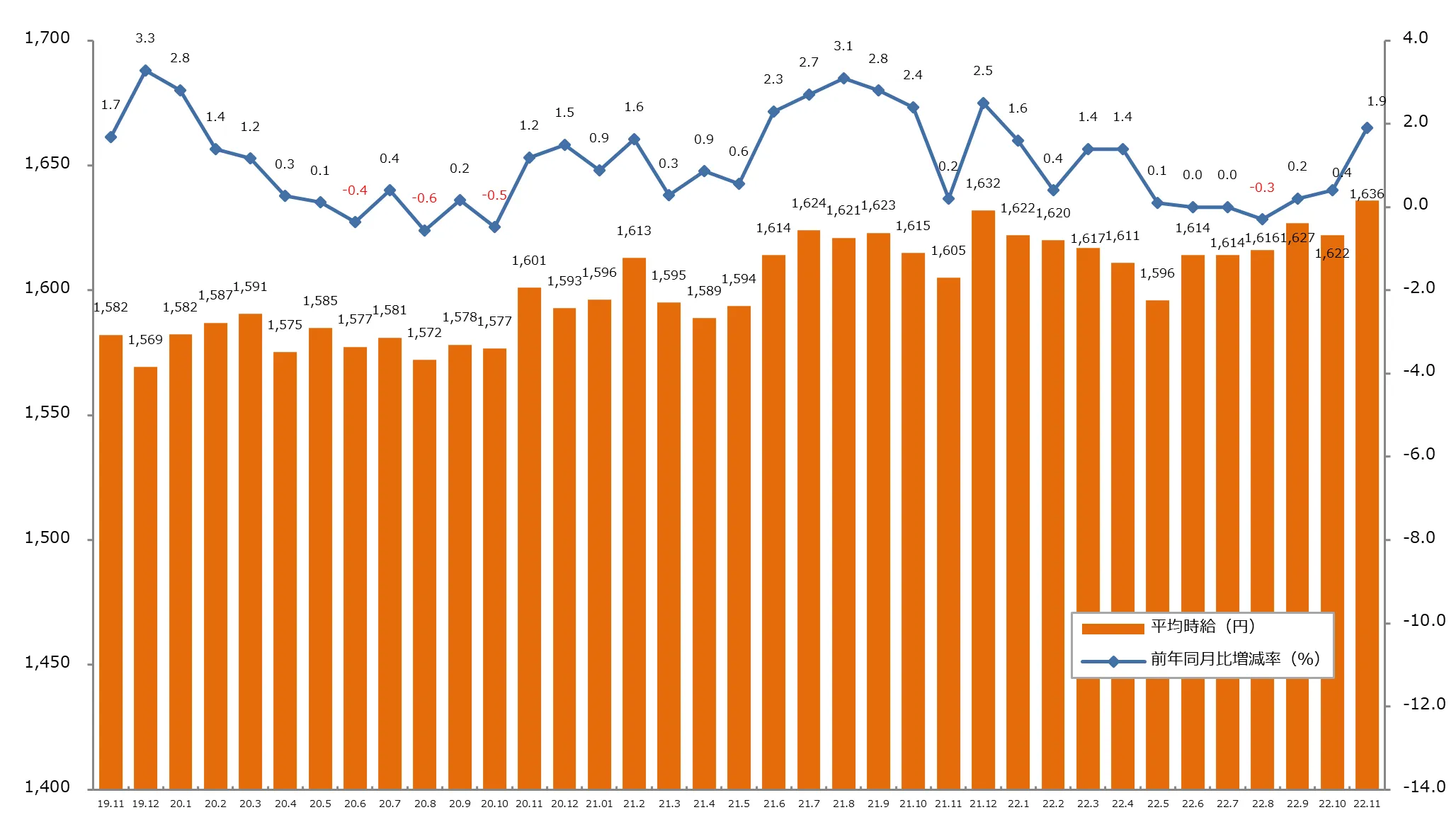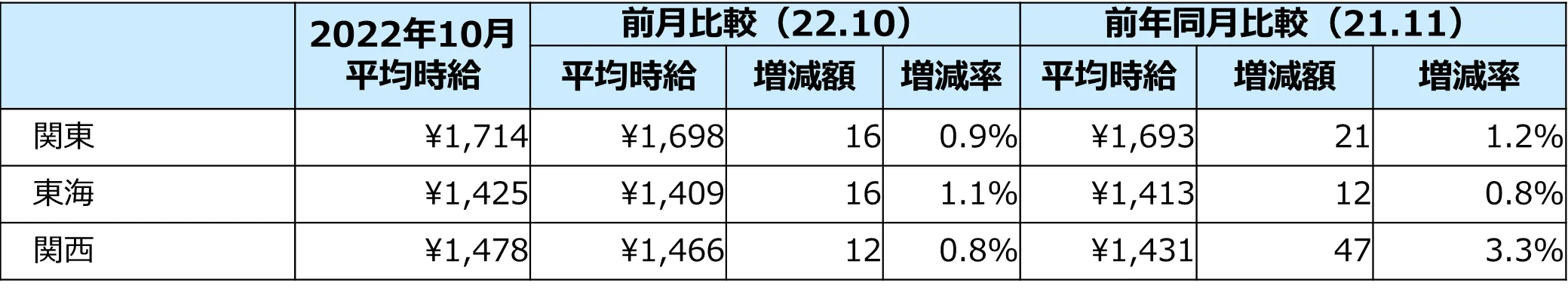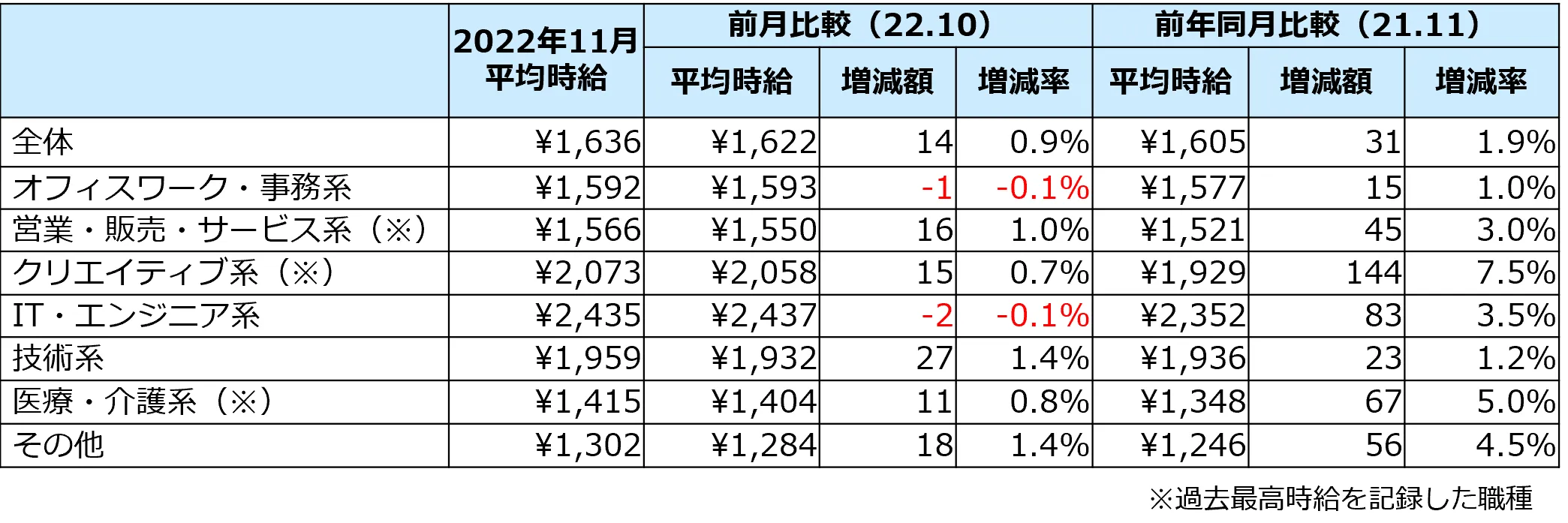 2022年11月度の三大都市圏平均時給は1,636円(前月比+14円・0.9%増、前年同月比+31円・1.9%増)。2021年12月度の平均時給1,632円を4円上回り、過去最高時給を記録しました。また全職種が前年同月比を上回るのは10ヵ月連続です。