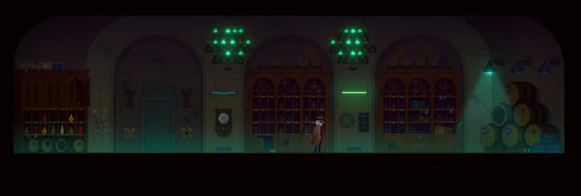ここは主人公(レックス)のオフィスです。一階は受付ロビーになっており、歴代当主が収集したコレクションが置かれている場所です。変な仮面、殺人事件に残されたソファー、古い時代の武士たち、レトロな蓄音機、そして天井からぶら下がっている、本物か偽物かわからないの骸骨の棚が飾っています。