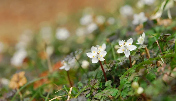 まばらな温帯夏緑林の林内や草地に生える小型の多年草。茎は高さ5~15cmになります。5枚の白色の萼片から覗く黄色い花弁はよく目立ち、蜜を出して虫を呼び寄せます。本州の関東地方以西に分布する日本の特産種で、石灰地域によく見られる傾向にあります。当園は約20,000球のセツブンソウを植栽しています。