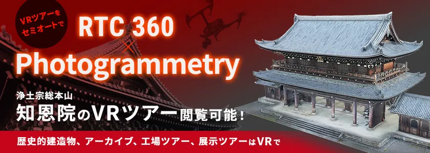 寺社仏閣・歴史的建造物・展示場といった、広大な空間をCG化することを可能にするのが、世界最高峰の高性能3DレーザースキャナーRTC360(Leica Geosystems製)です。RTC360はW270m×H135mの空間を1分40秒で高速スキャンニング撮影し、撮影データをセミオートで点群データへ変換するため、コストと工数の大幅な削減を実現しています。