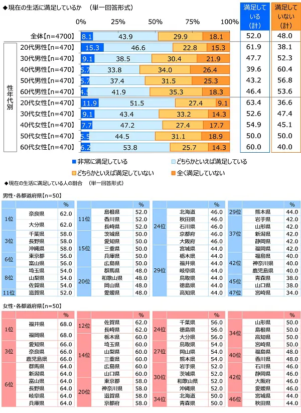 男女・都道府県別にみると、現在の生活に満足している人の割合が最も高くなったのは、男性では奈良県と大分県(いずれも62.0%)、女性では福井県と福岡県(いずれも68.0%)でした。
