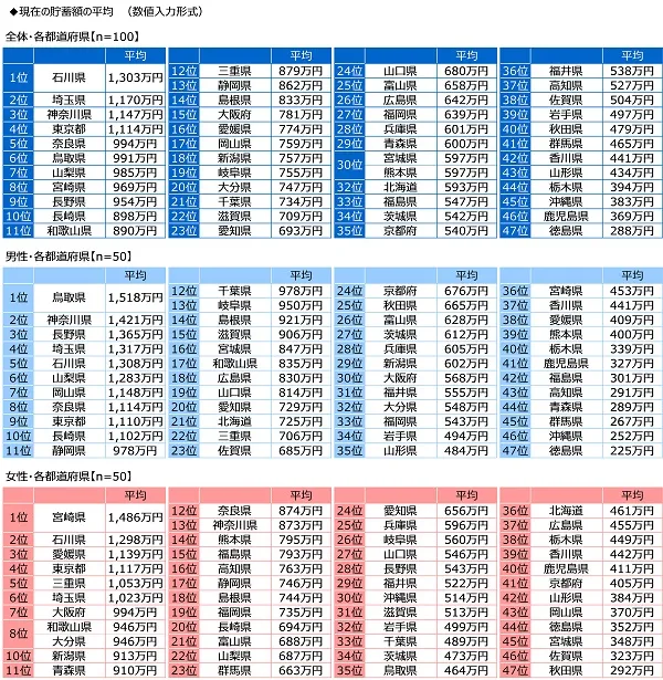 都道府県別にみると、現在の貯蓄額の平均は、1位は石川県(1,303万円)、2位は埼玉県(1,170万円)、3位は神奈川県(1,147万円)、4位は東京都(1,114万円)、5位は奈良県(994万円)となり、男女別では男性1位が鳥取県(1,518万円)、女性1位が宮崎県(1,486万円)でした。