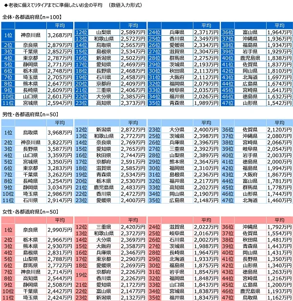 都道府県別にみると、老後に備えてリタイアまでに準備したいお金の平均は、1位は神奈川県(3,268万円)、2位は奈良県(2,879万円)、3位は千葉県(2,852万円)、4位は東京都(2,787万円)、5位は静岡県(2,771万円)となり、男女別では男性1位が鳥取県(3,968万円)、女性1位が奈良県(2,990万円)でした。