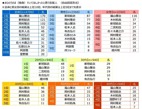 ・おひとりさま(独身)でいてほしかったと思う芸能人 男性回答1位「新垣結衣さん」、女性回答1位「福山雅治さん」