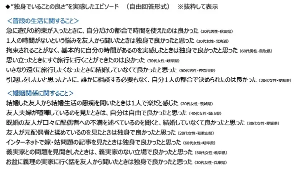 ・“独身でいることの良さ”を実感したエピソード 「思い立ったときにすぐ旅行に行くことができたのは良かった」「拘束されることがなく、基本的に自分の時間があるのを実感したときは独身で良かったと思った」「結婚した友人から結婚生活の愚痴を聞いたときは1人で楽だと感じた」など